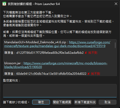CurseForge 已封鎖部分模組的下載權限,讓如 Prism Launcher 的第三方啟動器無法做到一鍵安裝模組包的功能。本文要來說明在 Prism Launcher 中碰到封鎖下載時,要如何手動下載指定模組。