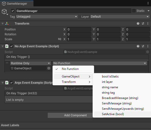 在 上一篇文章中宣告好 Unity 事件 後,除了能用 C# 來監聽與定義觸發事件後要執行的程式,也可以在檢查器中設定。本文要來介紹如何在 Unity 的檢查器中設定無參數與有參數的事件。