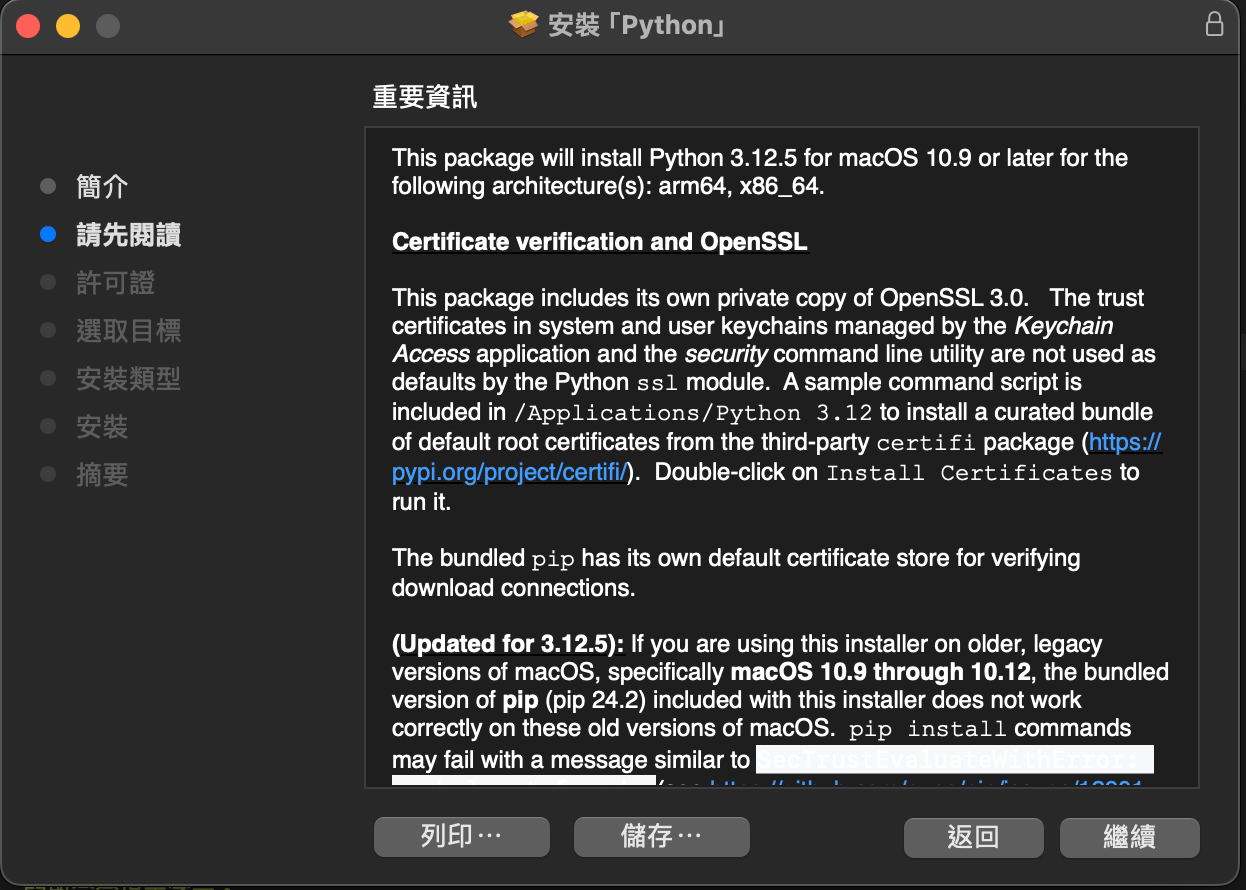 /Library/Frameworks/Python.framework/Versions/3.12位置,並於/usr/local/bin/python3.12建立 Symbolic Link 捷徑 (以 3.12 版本為例)。