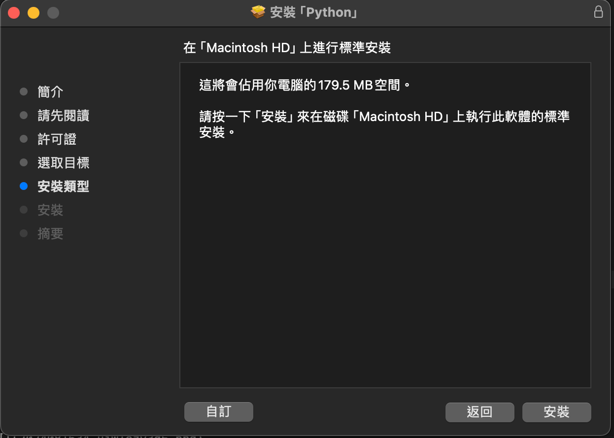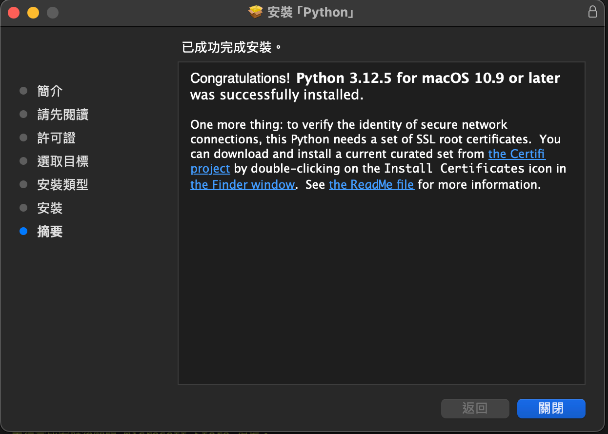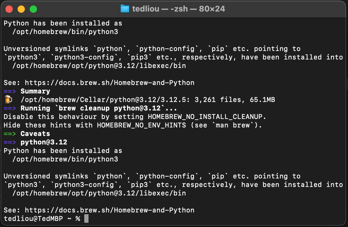 brew install python。 - 等待完成安裝後關閉終端機視窗。