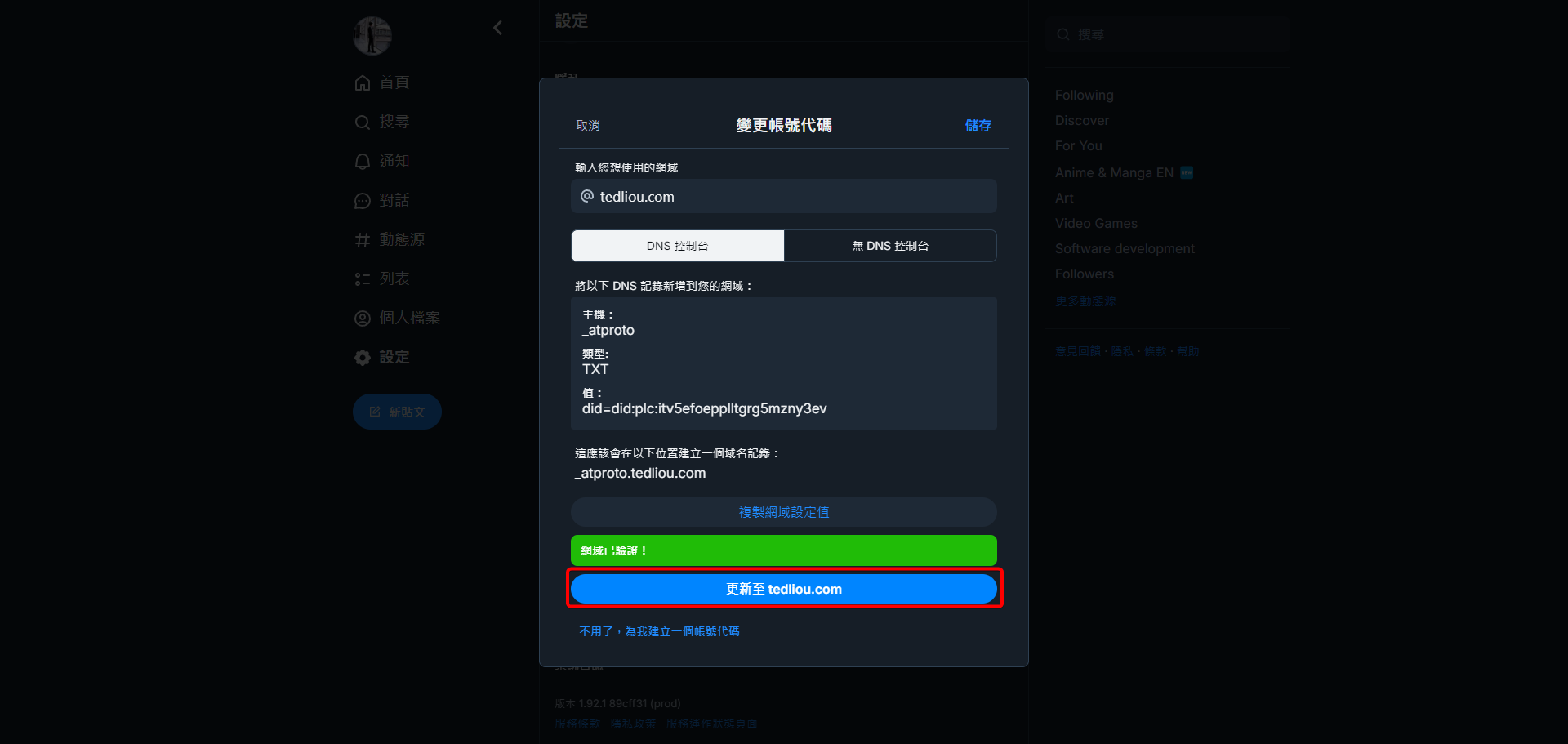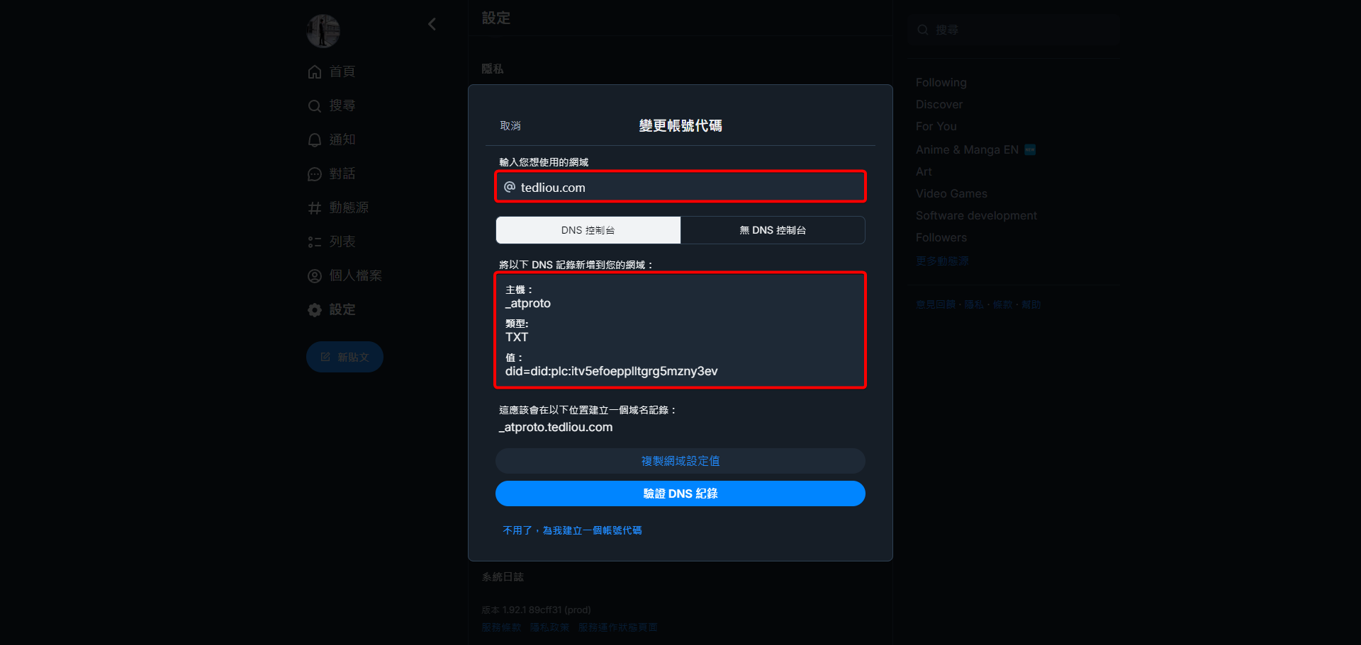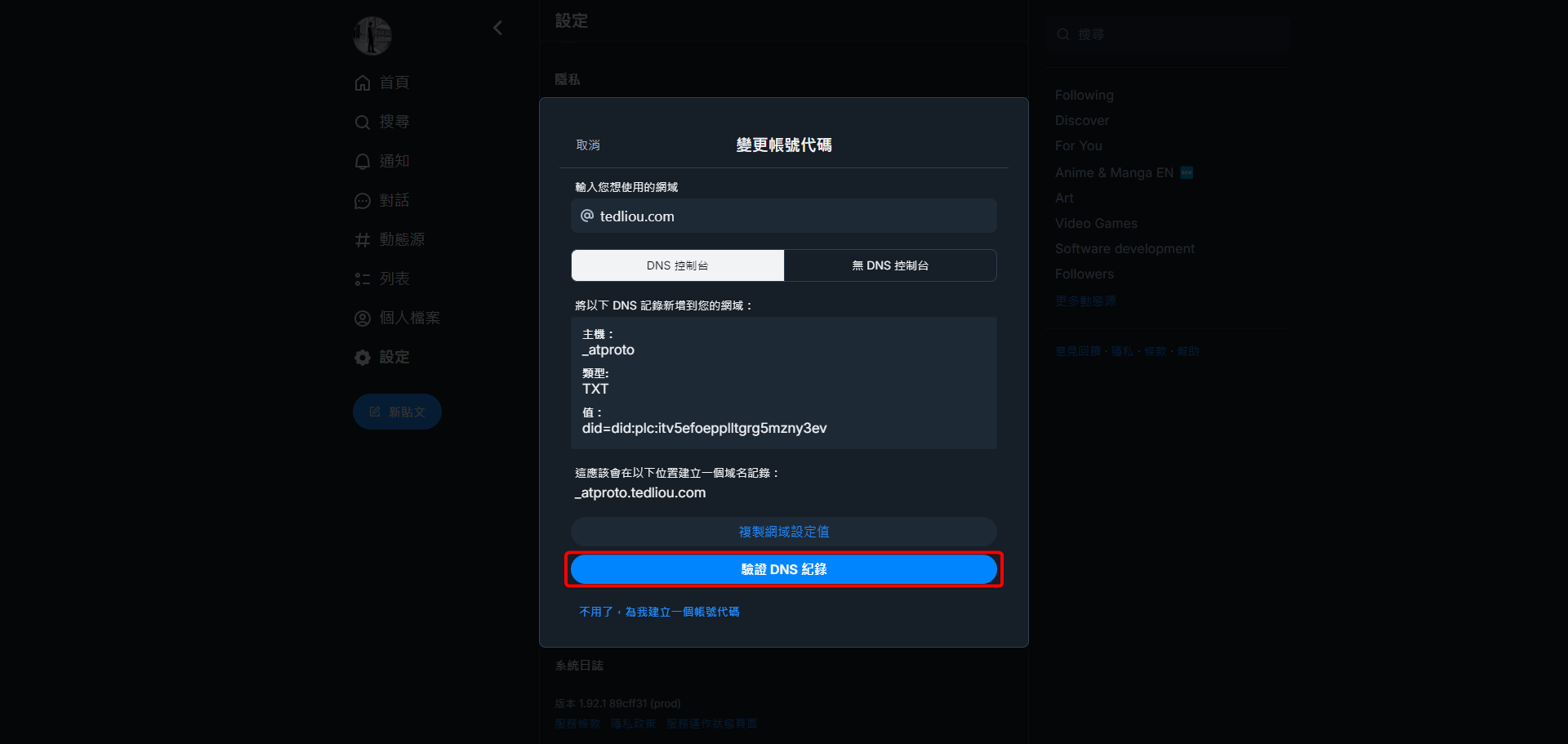 回到先前的 Bluesky 頁面,由於我們已新增好必要的 DNS 紀錄,因此現在可以點擊驗證 DNS 紀錄來讓 Bluesky 知道我們擁有這個網址。