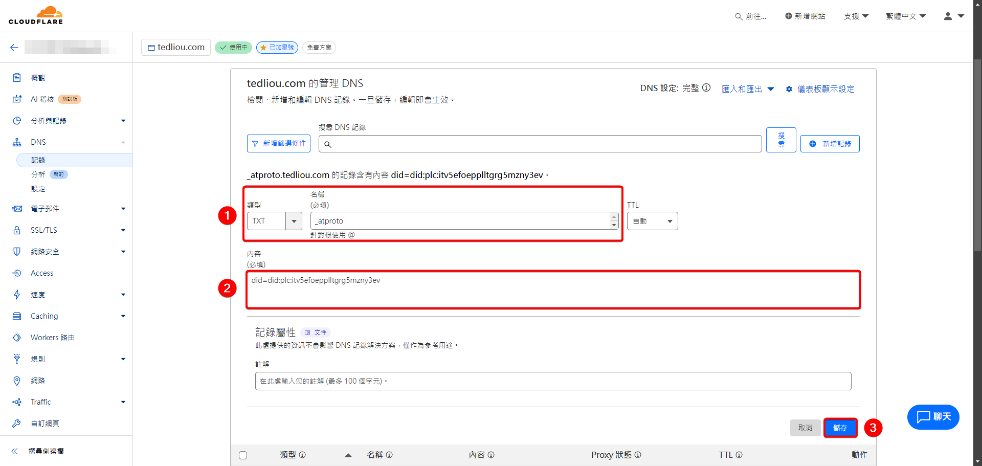Bluesky 會查詢你的網址有沒有設定它提供的 TXT 紀錄來驗證你是不是真的擁有這個網址,所以我們現在要進入 Cloudflare 後台的網站 > 你的網址 > DNS 來新增一個 TXT 紀錄。