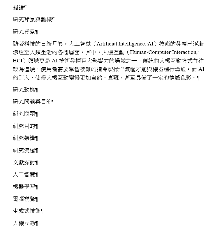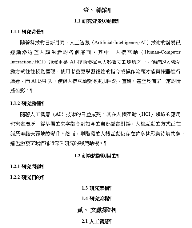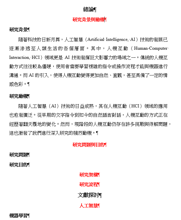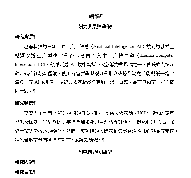 - 設定 研究背景與動機 的格式為學校要求的規格,本文使用字型大小 12、粗體、置中對齊作為範例。