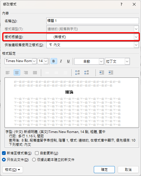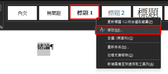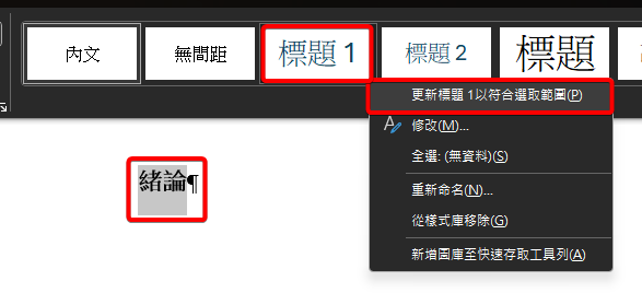- 反白選取 緒論,並在 常用 > 樣式 > 標題 1 上點擊 右鍵 > 更新標題 1 以符合選取範圍,緒論的格式將被同步到標題 1 樣式中。