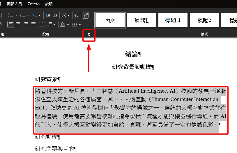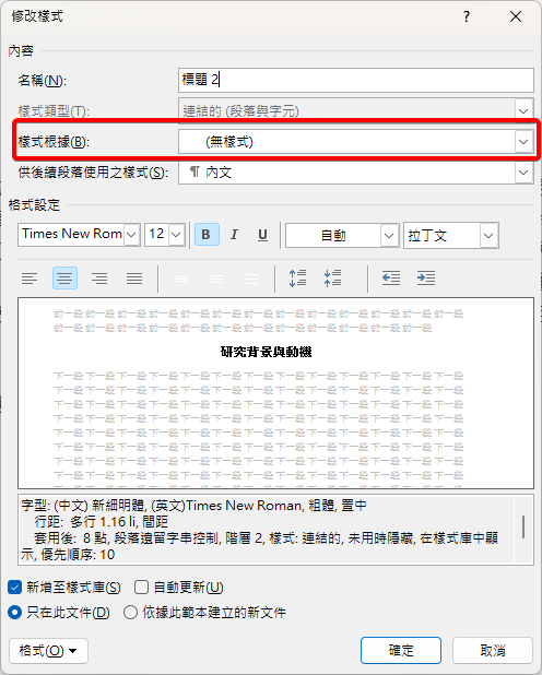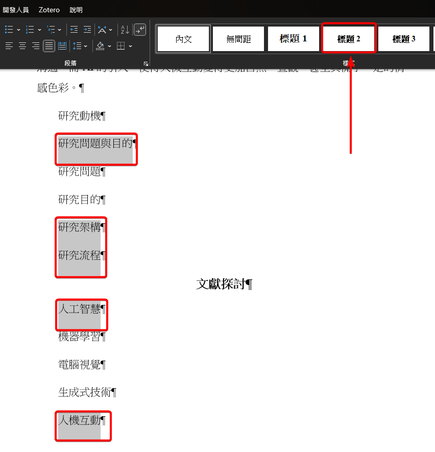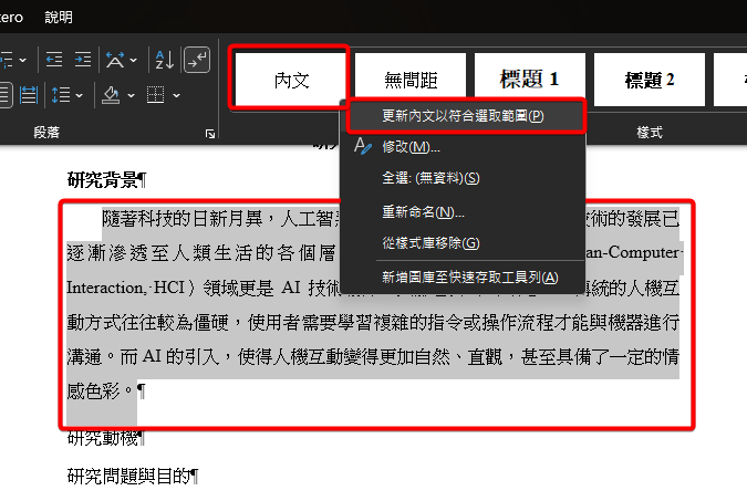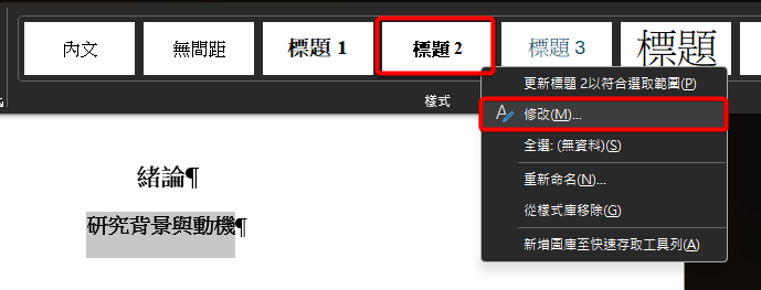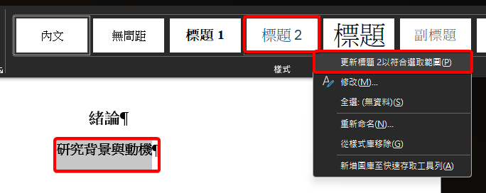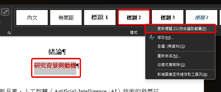 - 反白選取 研究背景與動機,並在 常用 > 樣式 > 標題 2 上點擊 右鍵 > 更新標題 2 以符合選取範圍,研究背景與動機的格式將被同步到標題 2 樣式中。