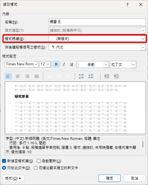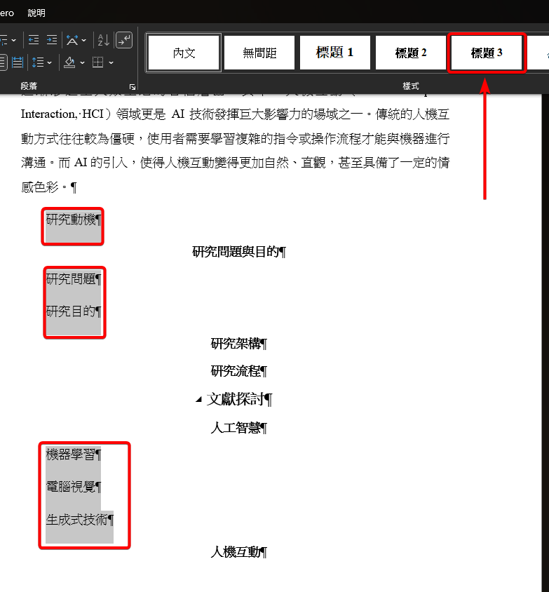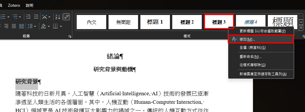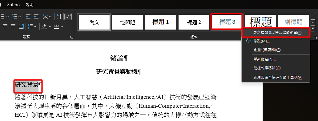 - 反白選取 研究背景,並在 常用 > 樣式 > 標題 3 上點擊 右鍵 > 更新標題 3 以符合選取範圍,研究背景的格式將被同步到標題 3 樣式中。