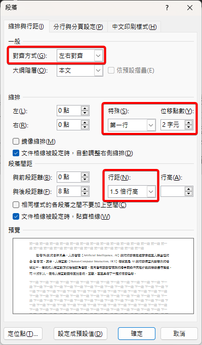 - 調整 行距 為「1.5 倍行高」,最後點擊確定套用設定。