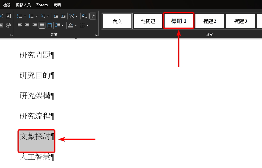 觀察結果,我們已建立論文的三種階層標題和內文的樣式並套用,之後撰寫的內容預設都會先套用會空兩格的「內容」樣式,如果要將它改成標題樣式的話就按照剛才的流程進行套用即可。