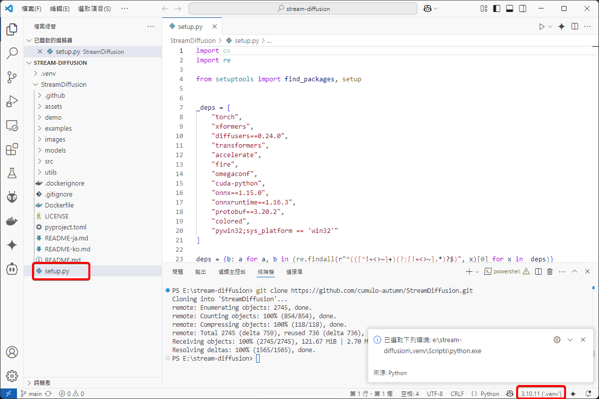 打開 StreamDiffusion 下的 setup.py,從右下角的按鈕來 建立 VENV 虛擬環境。