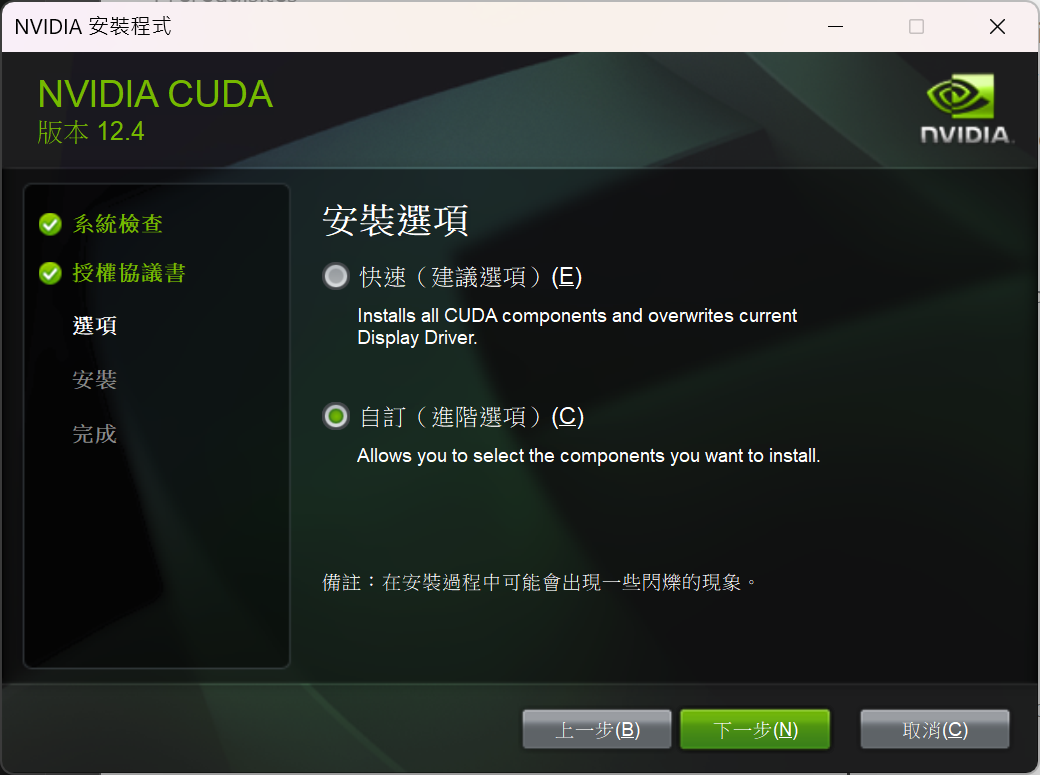 安裝的過程中注意一下,請務必在安裝選項這邊選擇「自訂」,並把除了 CUDA 以外的東西取消勾選,否則可能會安裝失敗。