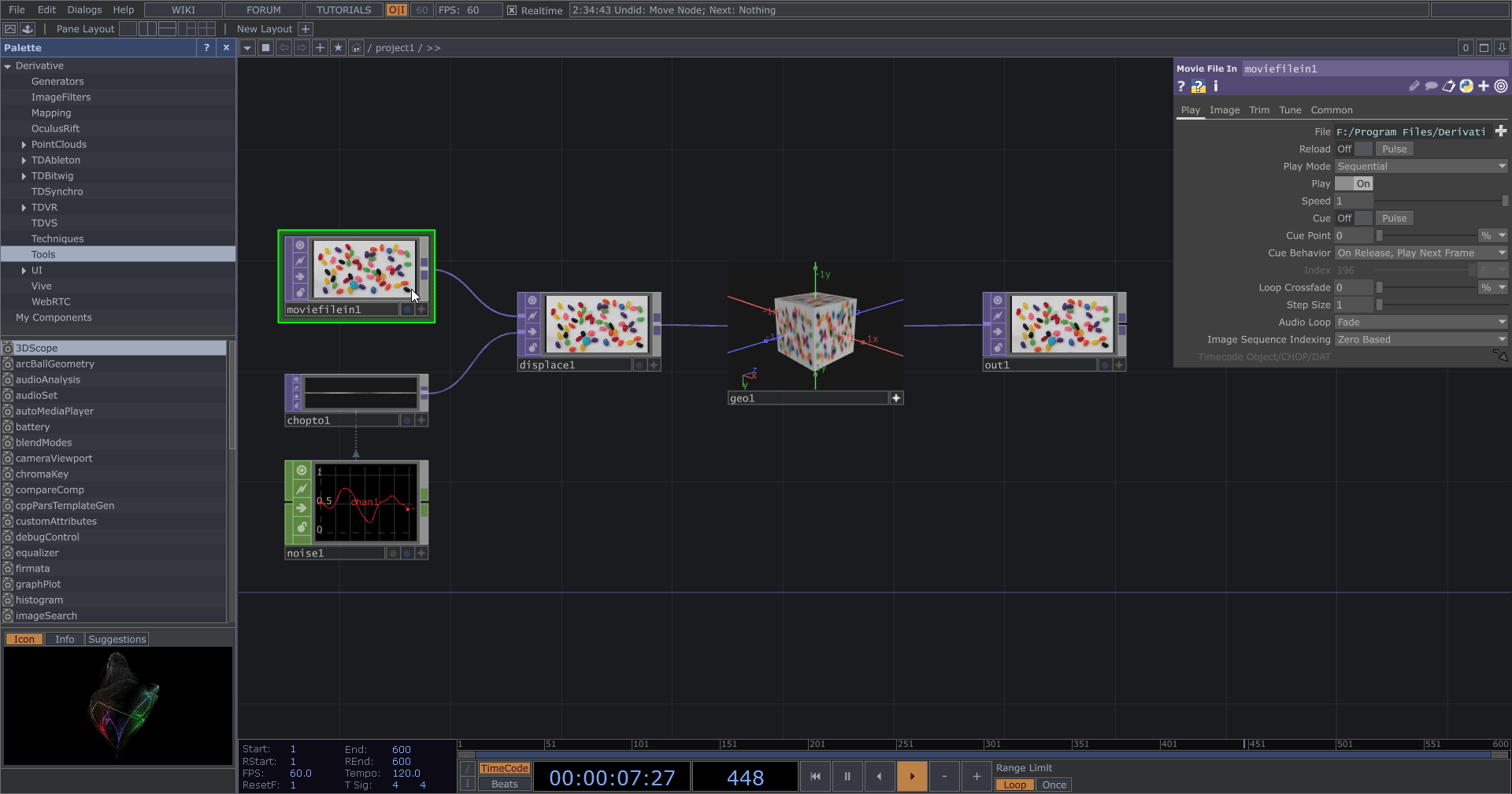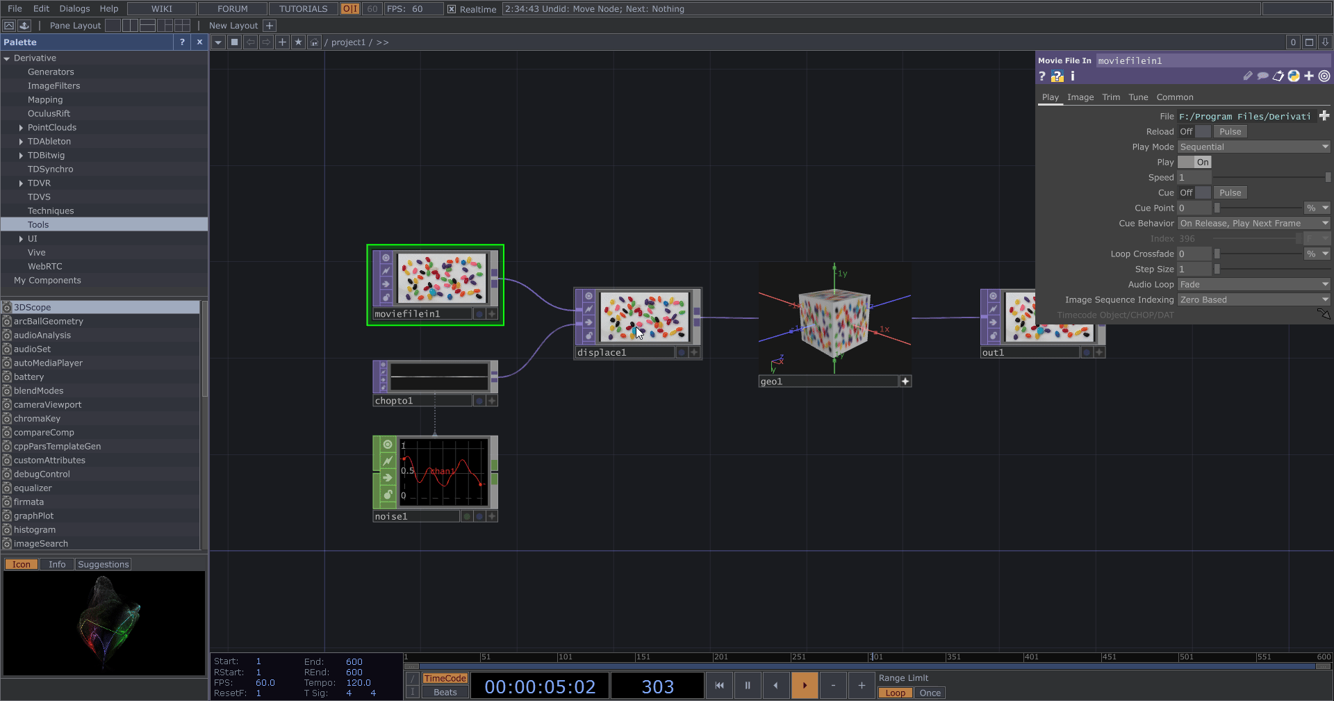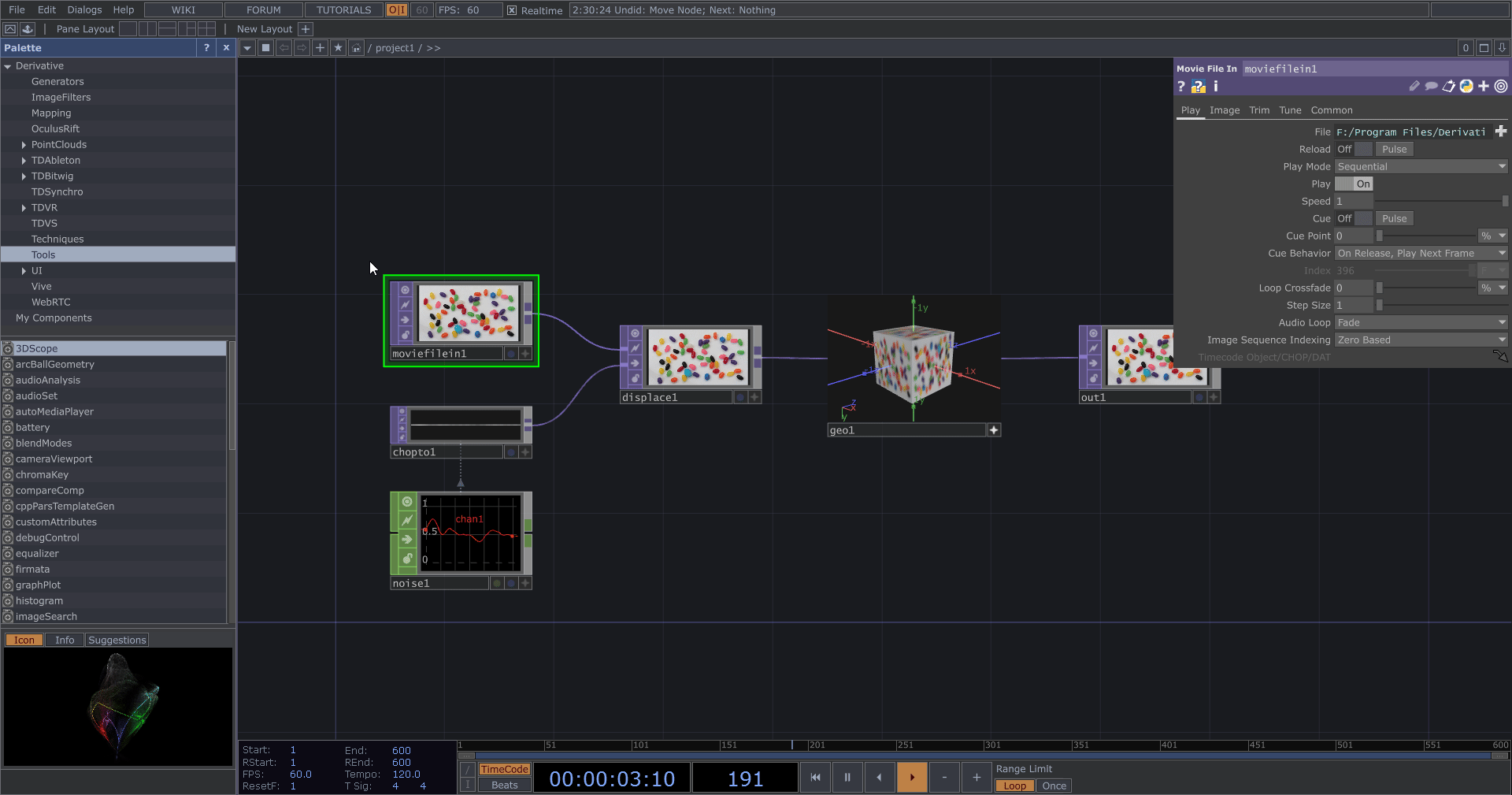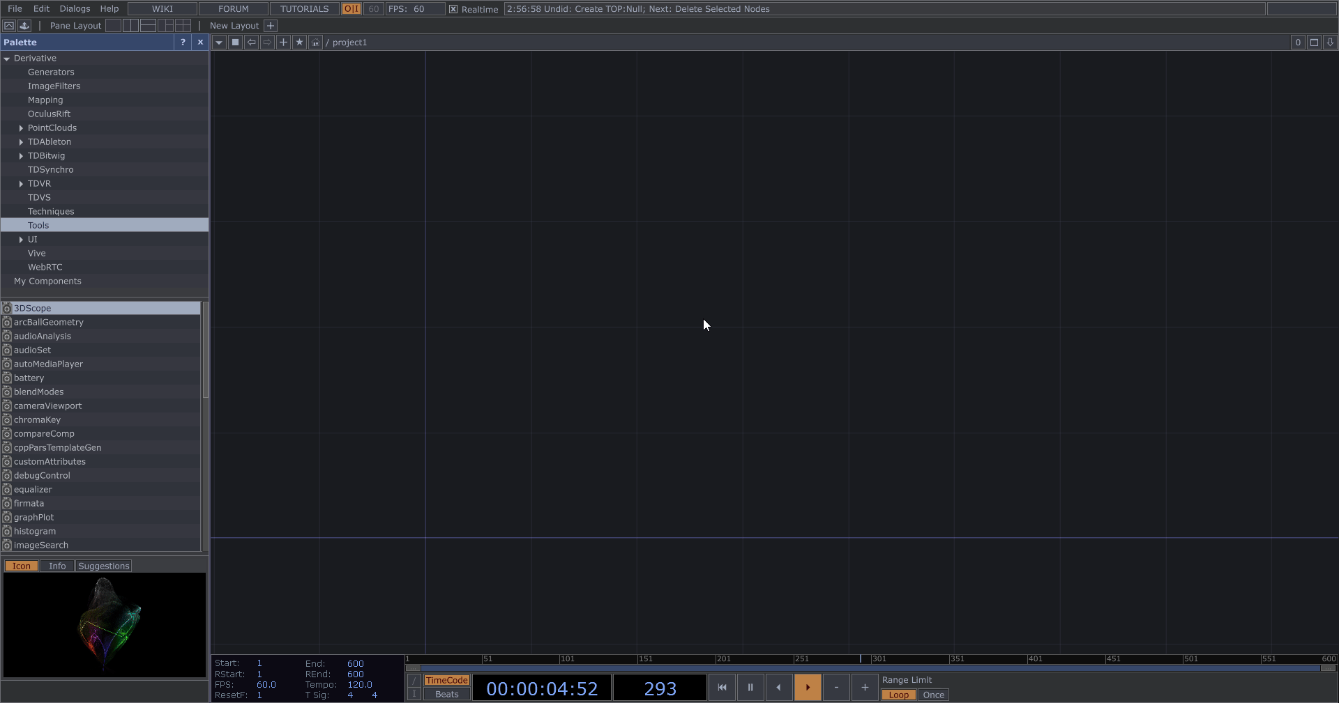 - 播放、暫停:點擊空白鍵控制 TouchDesigner 的播放或暫停,通常會保持播放狀態。如果電腦效能較差而影響編輯操作,可先行暫停,完成編輯後再恢復播放。
