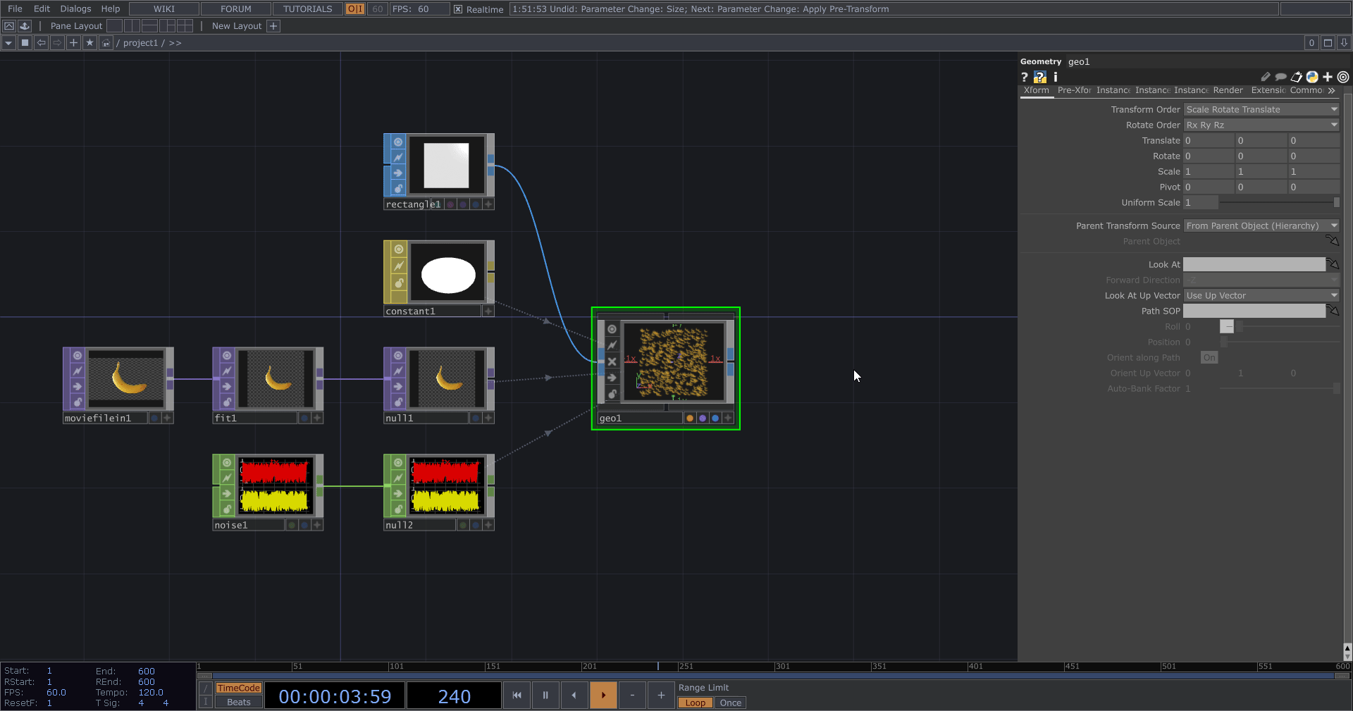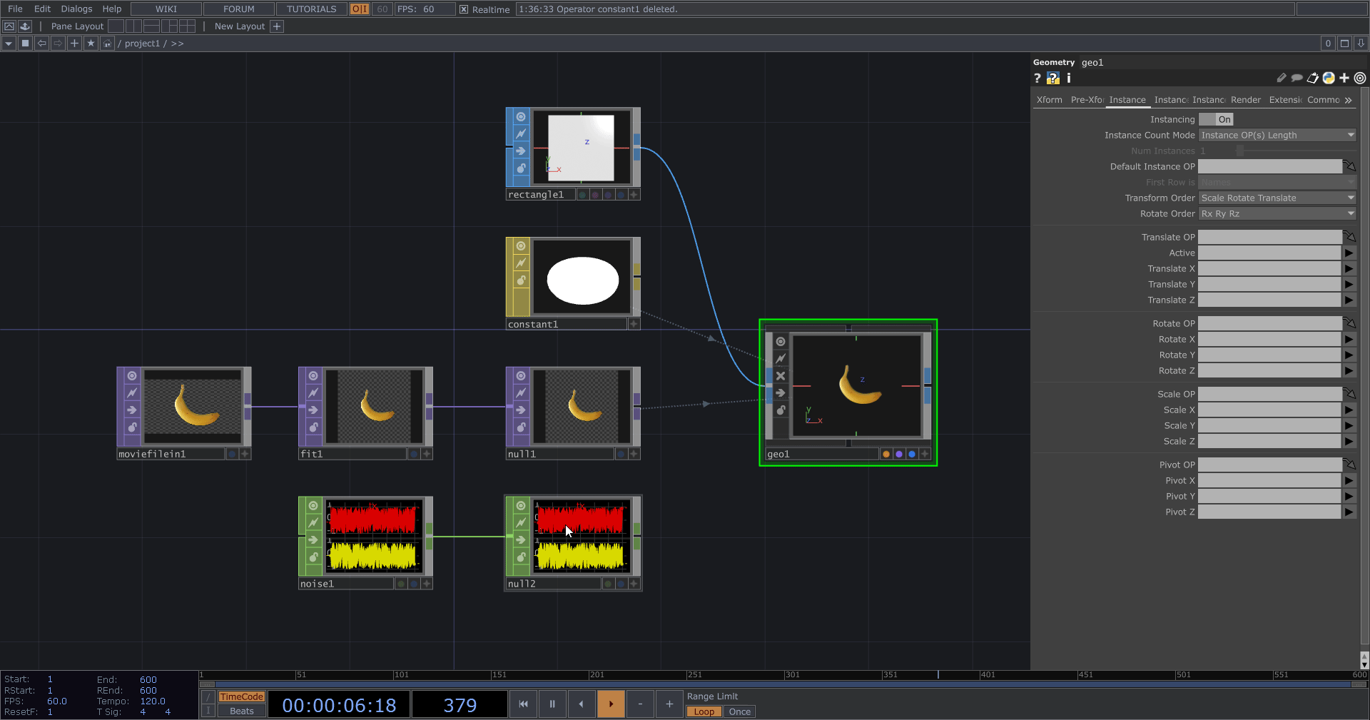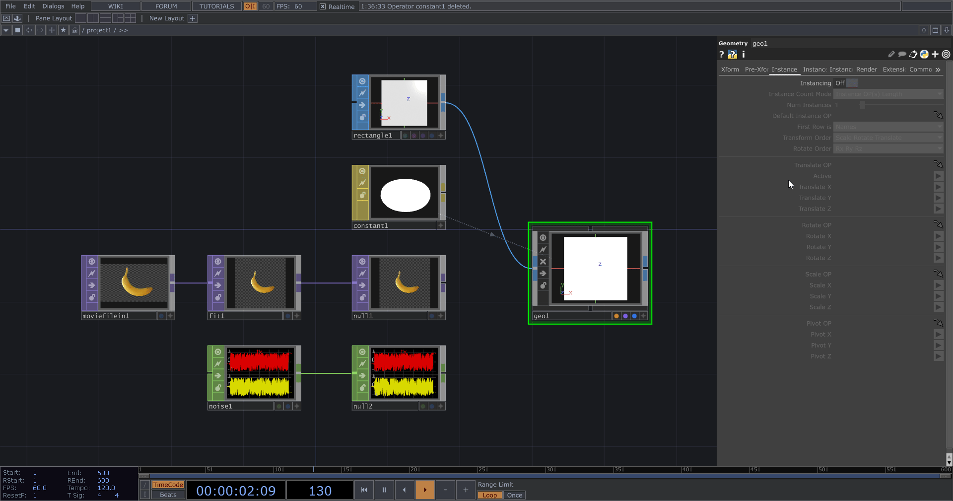 而實例化主要使用 Geometry COMP 來實作,因此最後會需要透過相機和 Render 來渲染結果,後續我們還可以用 TOP 對實例化的結果繼續進行製作。