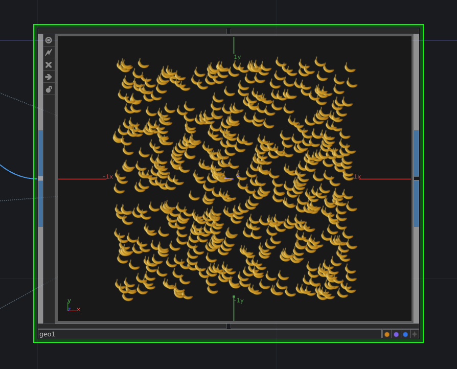 最後選取 Render 並按下 Shift + H 放大觀察,大小合適的香蕉已經用實例化的方式複製到隨機位置了!大香蕉真的很奇妙!