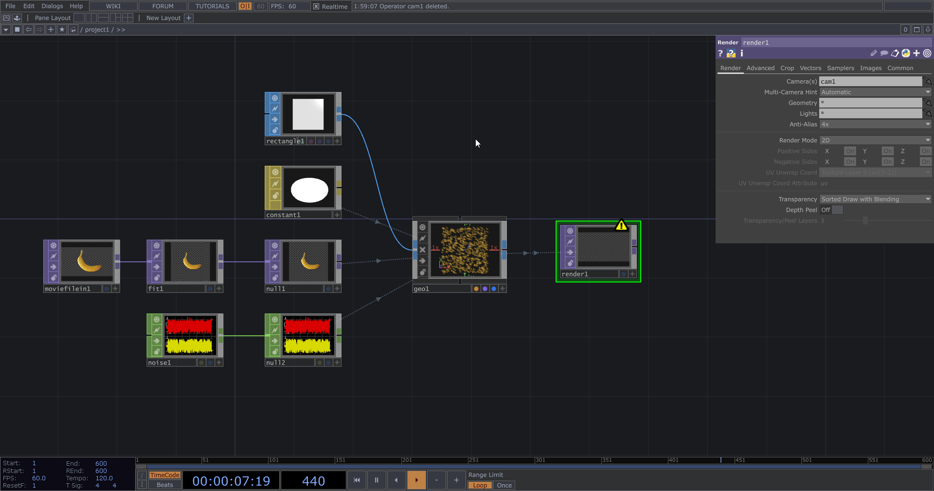 建立 TOP > Render 來渲染 Geometry 的內容,但是因為還沒有建立相機,所以看不到任何東西。