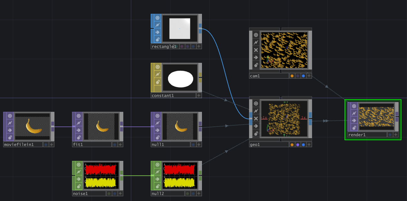 本文將教你把 TouchDesigner 內建的香蕉圖片大量實例化到隨機的位置,其中我們會接觸到最基礎的 SOP、MAT、亂數生成和相機渲染功能。下圖為本文要教學的實例化節點連接方法: