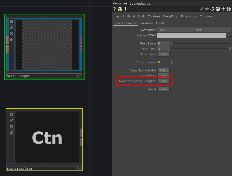 選取 sceneChanger,點擊 Generate Scene Template 的 Pulse。