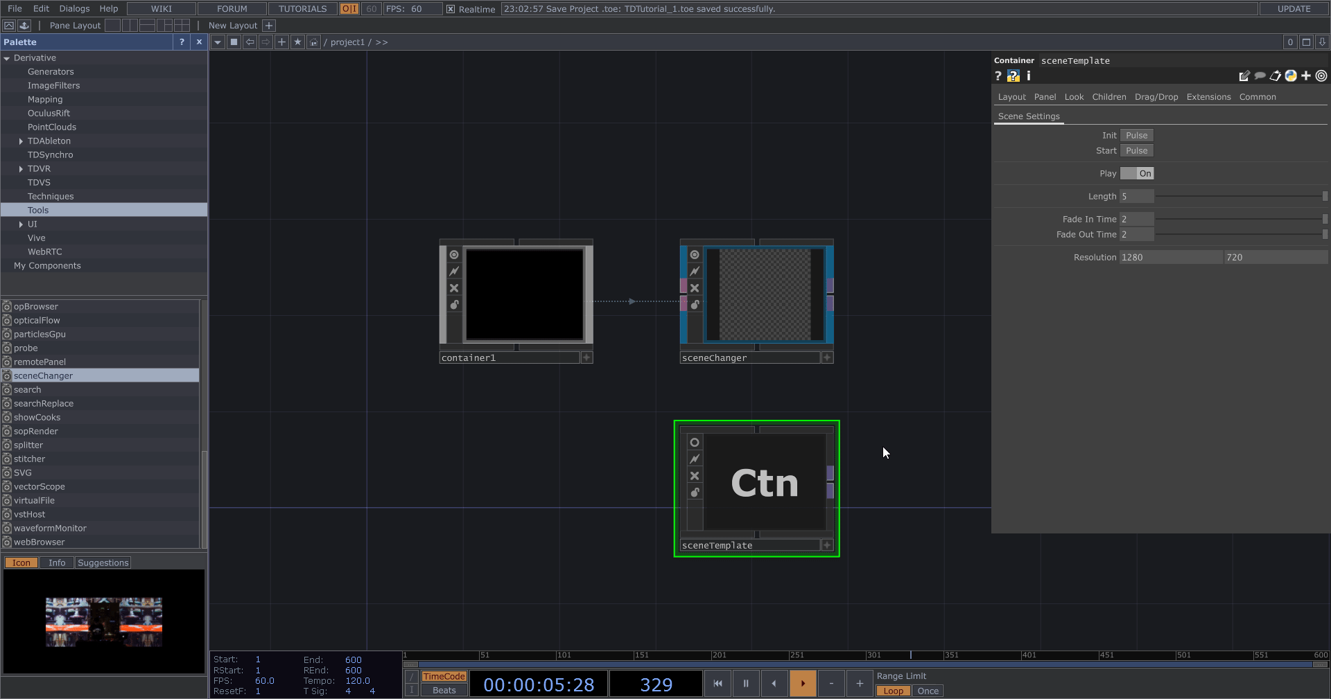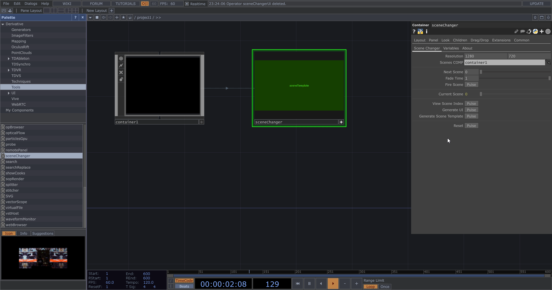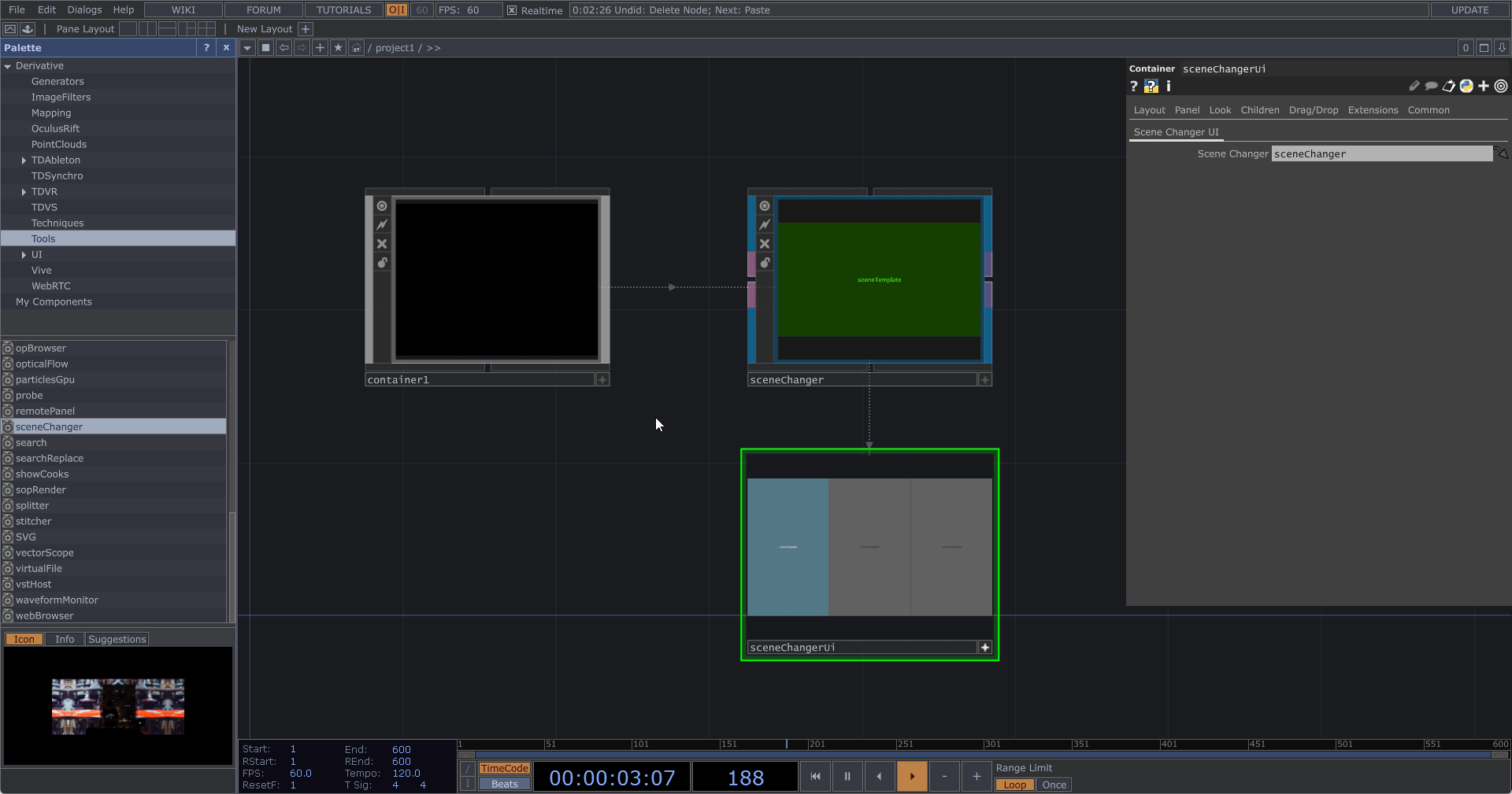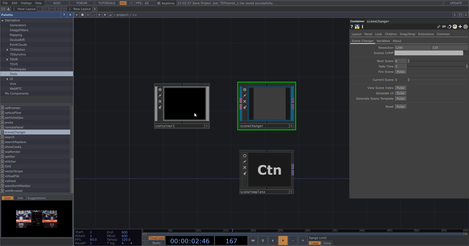 從左側 Palette 選擇 Tools 分類,拖曳下方的 sceneChanger 至中央。