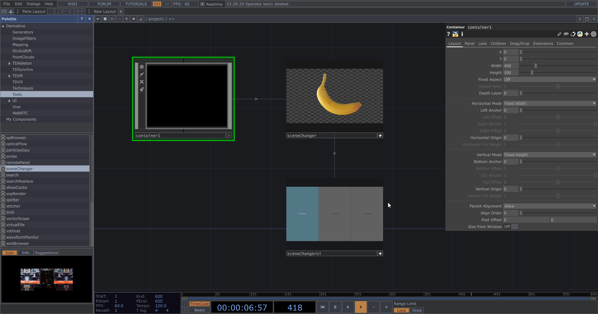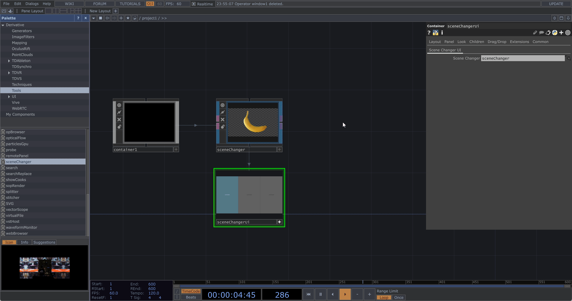 將 sceneChanger 拖曳至 Windows COMP 的 Window Operator。