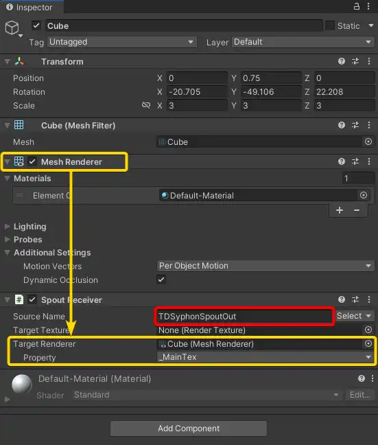 選取 Cube 並加入 KlakSpout 的 Spout Receiver 腳本。