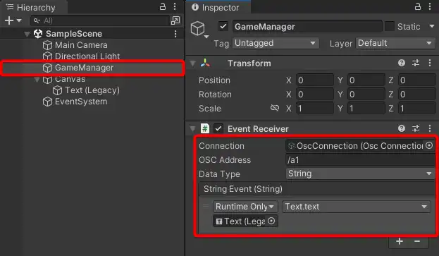 建立空物件 GameManager,加入 OSC Jack 的 Event Receiver 腳本。