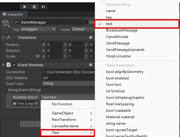 於 String Event 建立事件監聽,拖曳 Text (Legacy) 物件,並選擇 Dynamic string 內的 text。