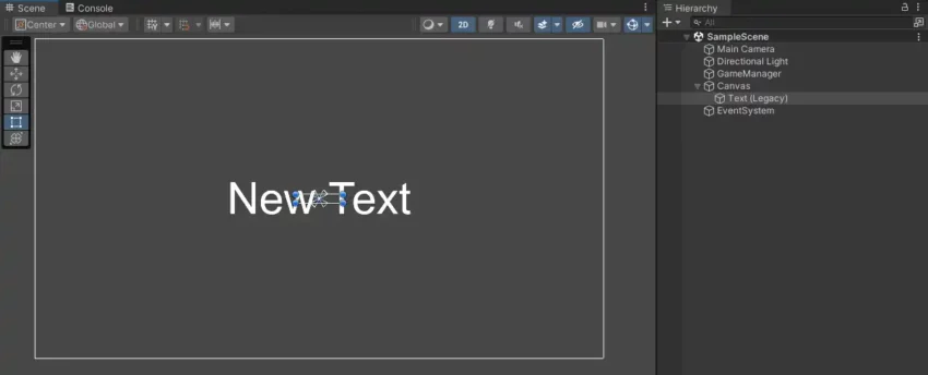 於 Canvas 中建立 Text (Legacy) 物件,調整文字顏色與大小讓它明顯一些。