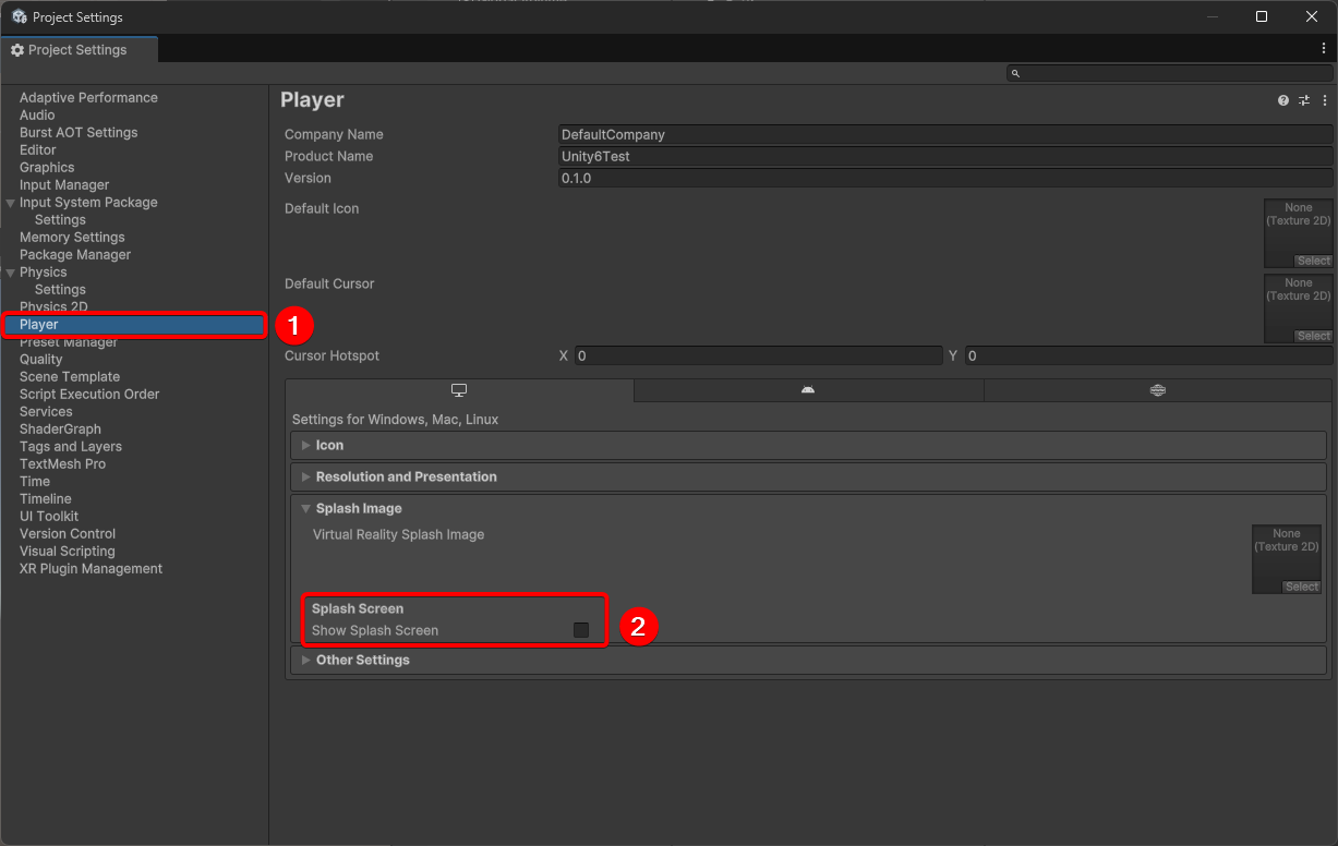 過去如果想關閉這個畫面,要馬申請個學生授權,不然就是用些偏門方法。到了 Unity 6,我們可以直接在專案設定中關閉,無須再搞這些手段。