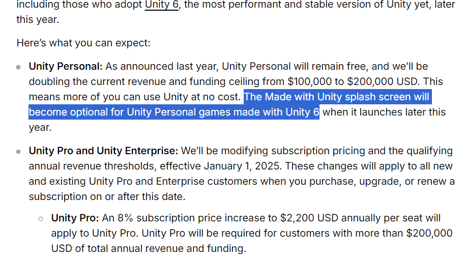 - Unity 6 開始,免費版開發者可以自由選擇是否要在啟動 Unity 開發的遊戲時顯示「Made with Unity」畫面。