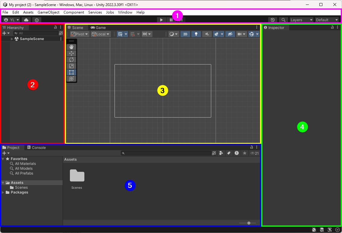 建立專案後看到的畫面就是 Unity 編輯器預設的長相,主要會用到的介面有: