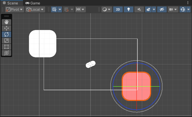 如果你要縮放或旋轉的物件有多個子物件,或子物件的位置跟父物件不同的時候,點擊 Scene 面板左上角的 Pivot 可以切換軸向模式或中心模式,中心模式會將控制器移動到所有子物件的中心,在操作時會有不同的效果。