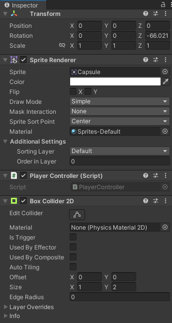 於 Hierarchy 中選取物件後,就可以在這個介面中查看與編輯物件屬性,也能在物件中掛上自己寫的腳本 (如下圖中的 Player Controller)。在 Inspector 中會以「Component」的方式將屬性切成不同的區塊。如下圖,Transform 就是一個獨立的 Component、Sprite Renderer 也是一個獨立的 Component。