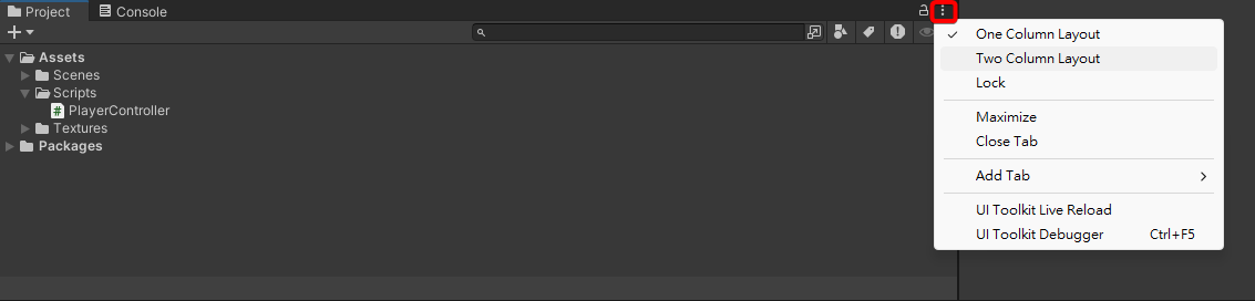 Project 面板預設的顯示方式是「Two Column Layout」,會以兩欄的方式顯示素材檔案。開發者可以點擊面版右上角的按鈕來改成「One Column Layout」單一欄位的顯示方式。