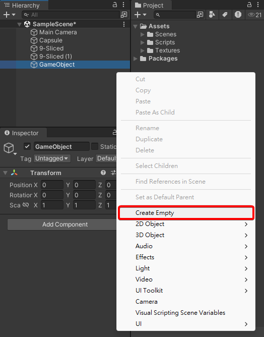 在 Hierarchy 中點擊滑鼠右鍵開啟選單,點擊 Create Empty 建立一個空物件。空物件是在開發時會很常用到的東西,可以用來群組一堆道具或單純拿來掛如 GameManager 之類的腳本。