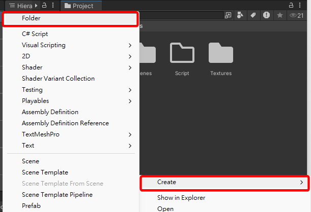 C# 腳本是 Unity 的核心,沒有它就什麼都動不起來。首先在 Project 面板中點擊右鍵 > Create > Folder 來建立一個 Sciprts 資料夾,用來存放我們寫的 C# 腳本。