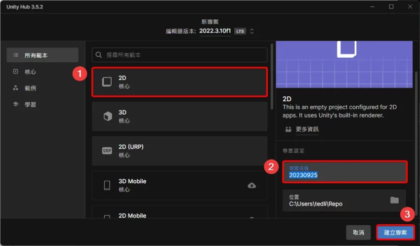 - 選擇 2D 或 3D 範本,取一個名稱後點擊 建立專案。