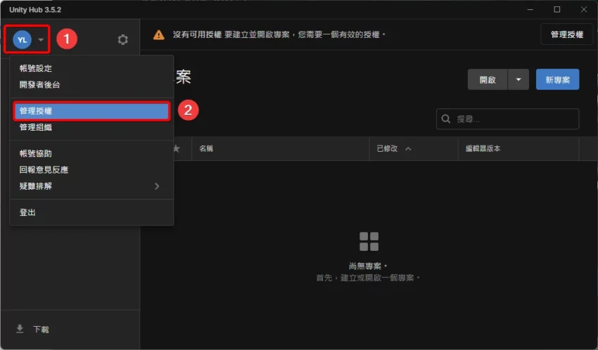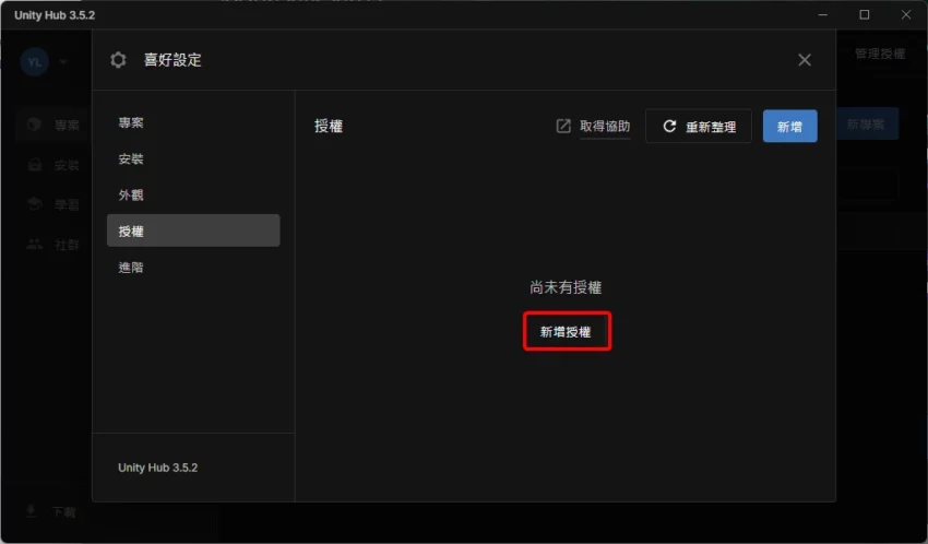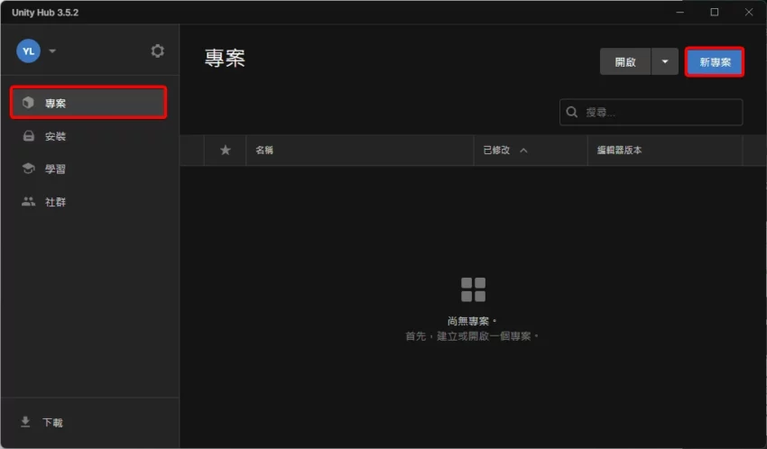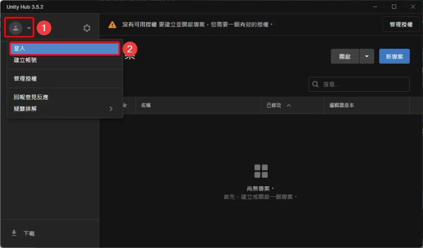 - 進入 Unity Hub 程式畫面,點擊左上角的頭像後再點擊 登入。