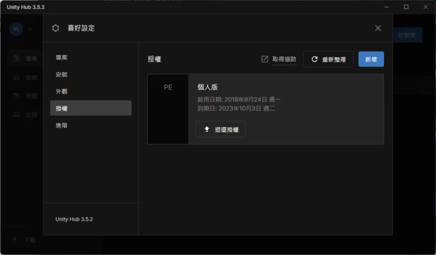 Unity 的使用需要申請授權,目前版本的授權方式分為: