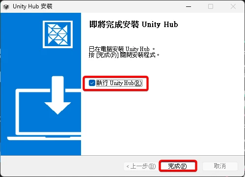 - 勾選 執行 Unity Hub,再點擊 完成 來啟動 Unity Hub。