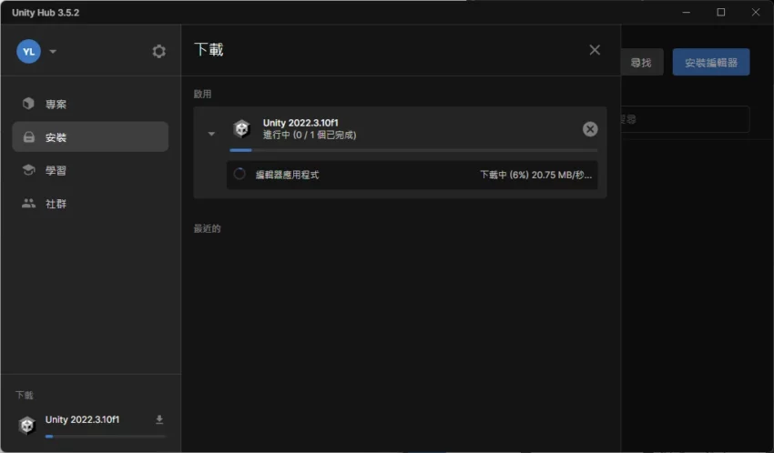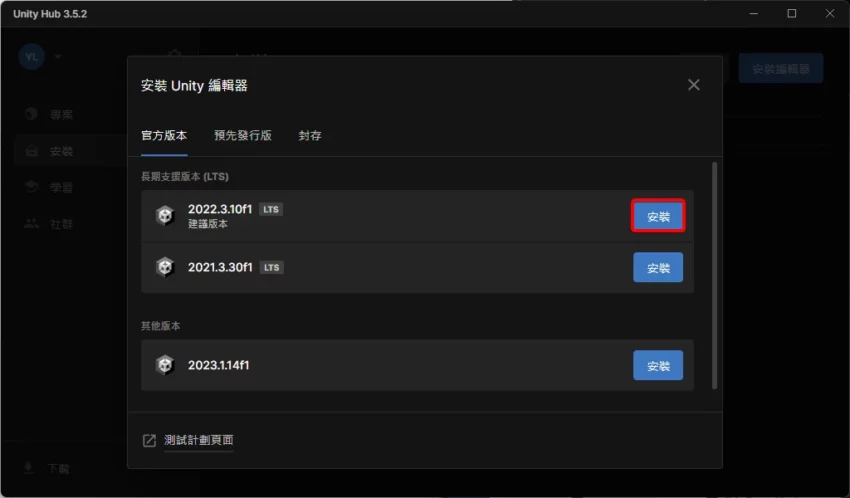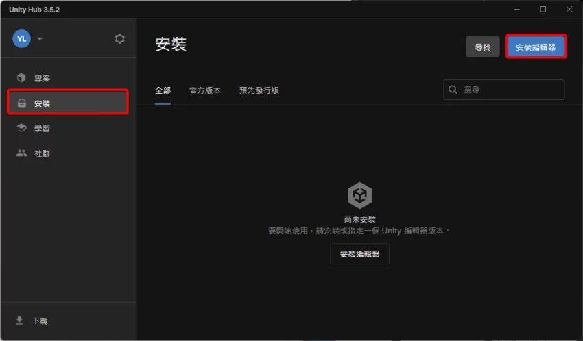 - 回到 Unity Hub,切換至 安裝 頁面,點擊 安裝編輯器。