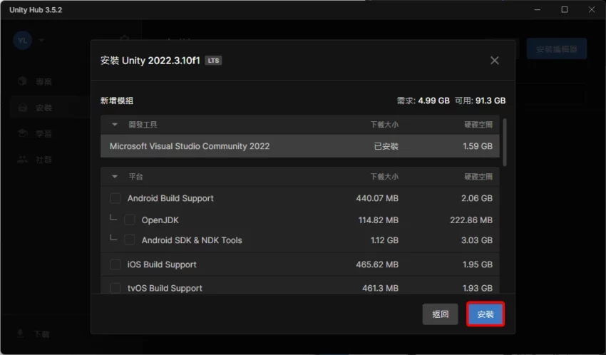 - 勾選開發工具中的 Microsoft Visual Studio Community 2022,再點擊 安裝。