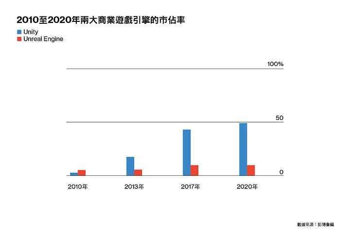 透過 Unity 製作的遊戲可以輸出到 Windows、macOS、Linux、Android、iOS 和 WebGL 等主流平台,囊括了 2D、3D 遊戲甚至是 AR、VR、MR 技術領域,再加上個人開發者能免費使用的特性,使這款引擎在 2021 年達到了 49.7% 的市占率。