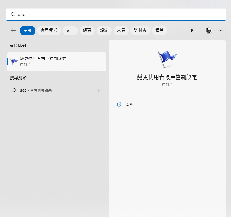 點擊 Windows 按鍵,輸入 uac 搜尋並開啟