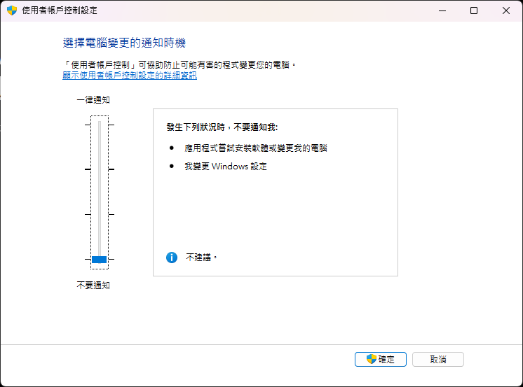 關閉 UAC 可以節省掉時間,但會犧牲了一道資訊安全的防護。關閉此設定後,未來請不要隨意下載來路不明與非正版軟體,以免中毒。如之後想要改回來,依照上文的步驟,將滑桿調整回第二格或一律通知即可。