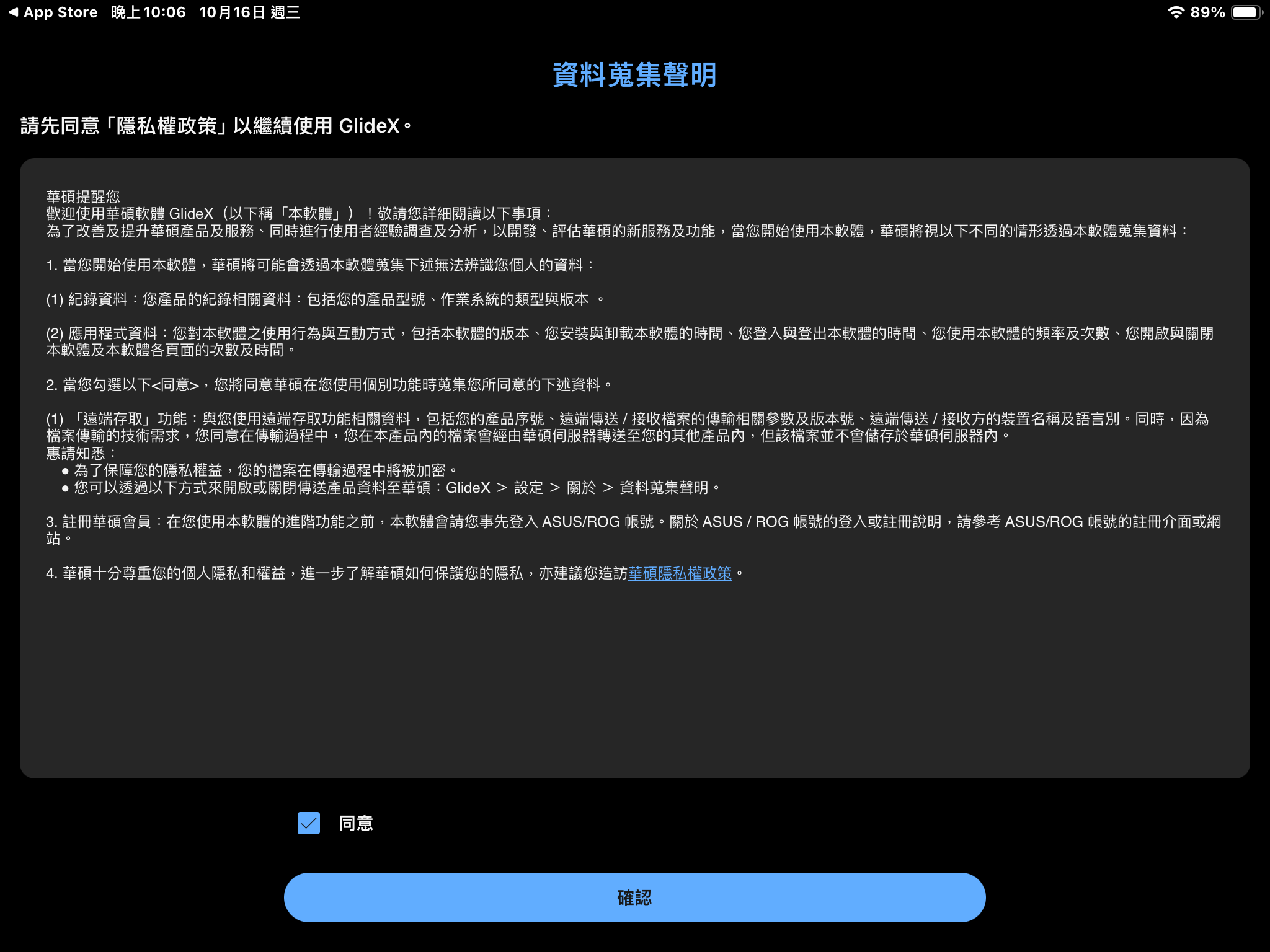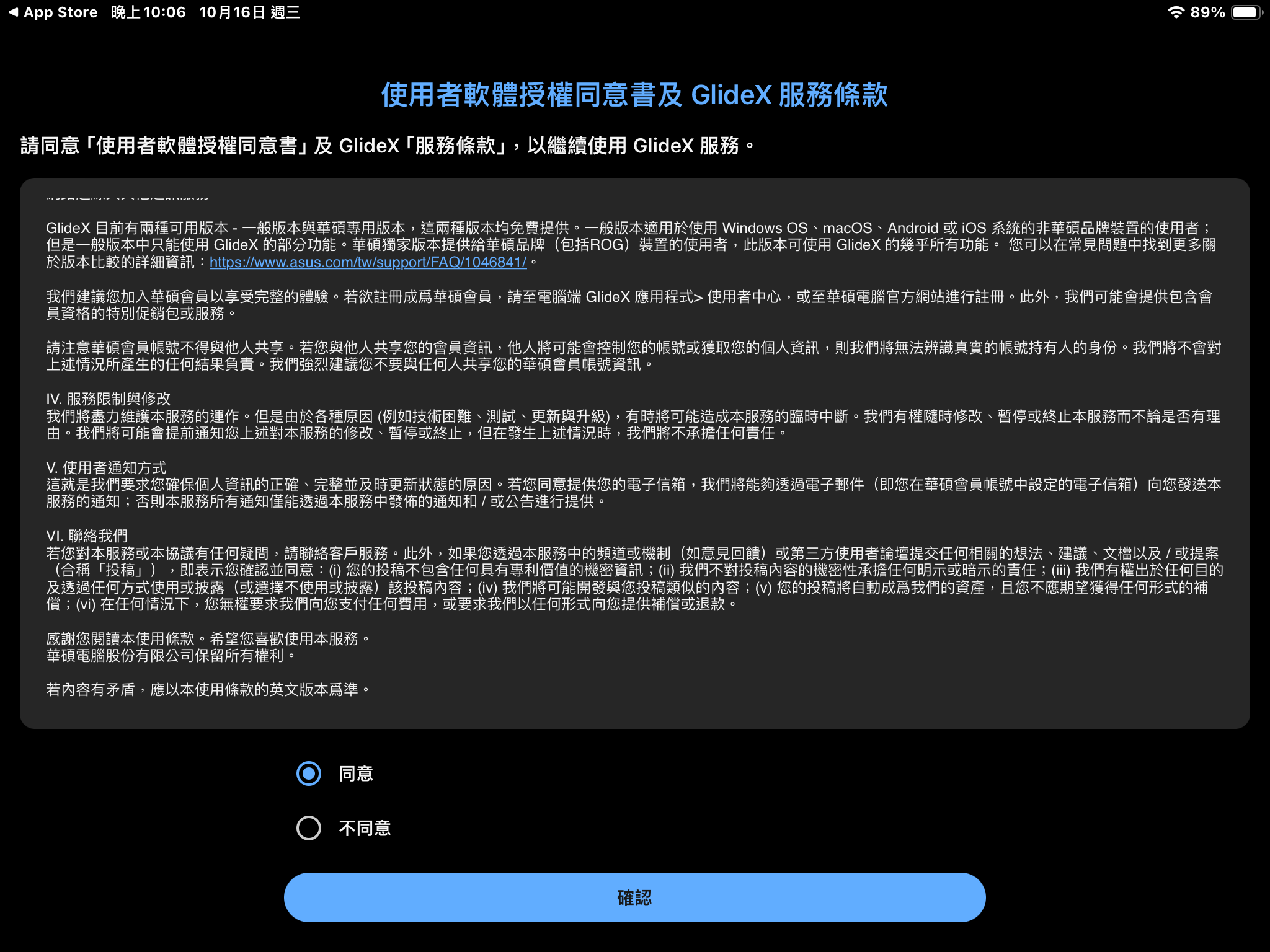 如同電腦版的流程,請同意使用者軟體授權同意書和服務條款,再點擊確認。