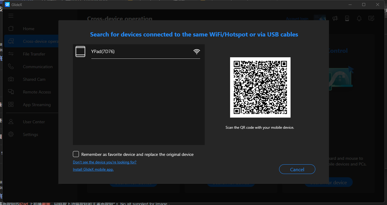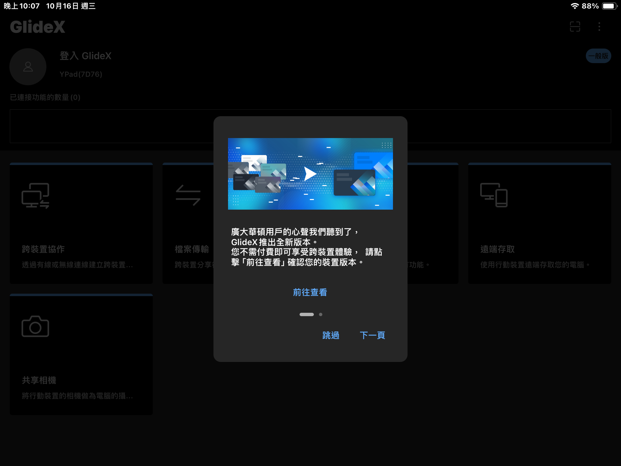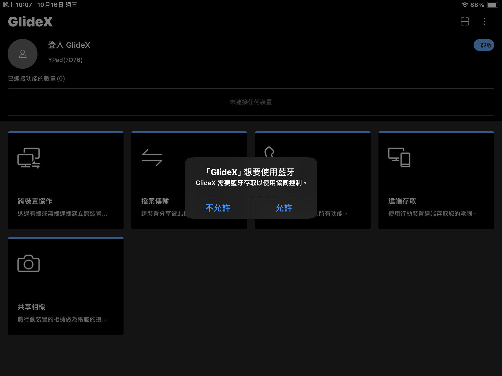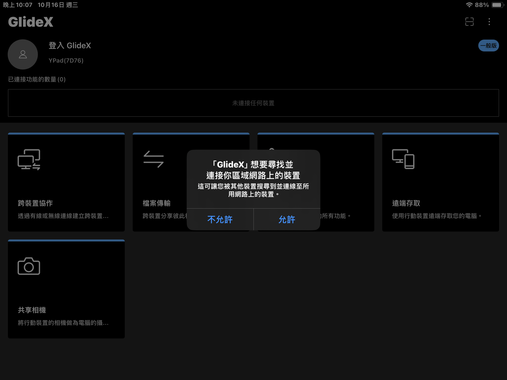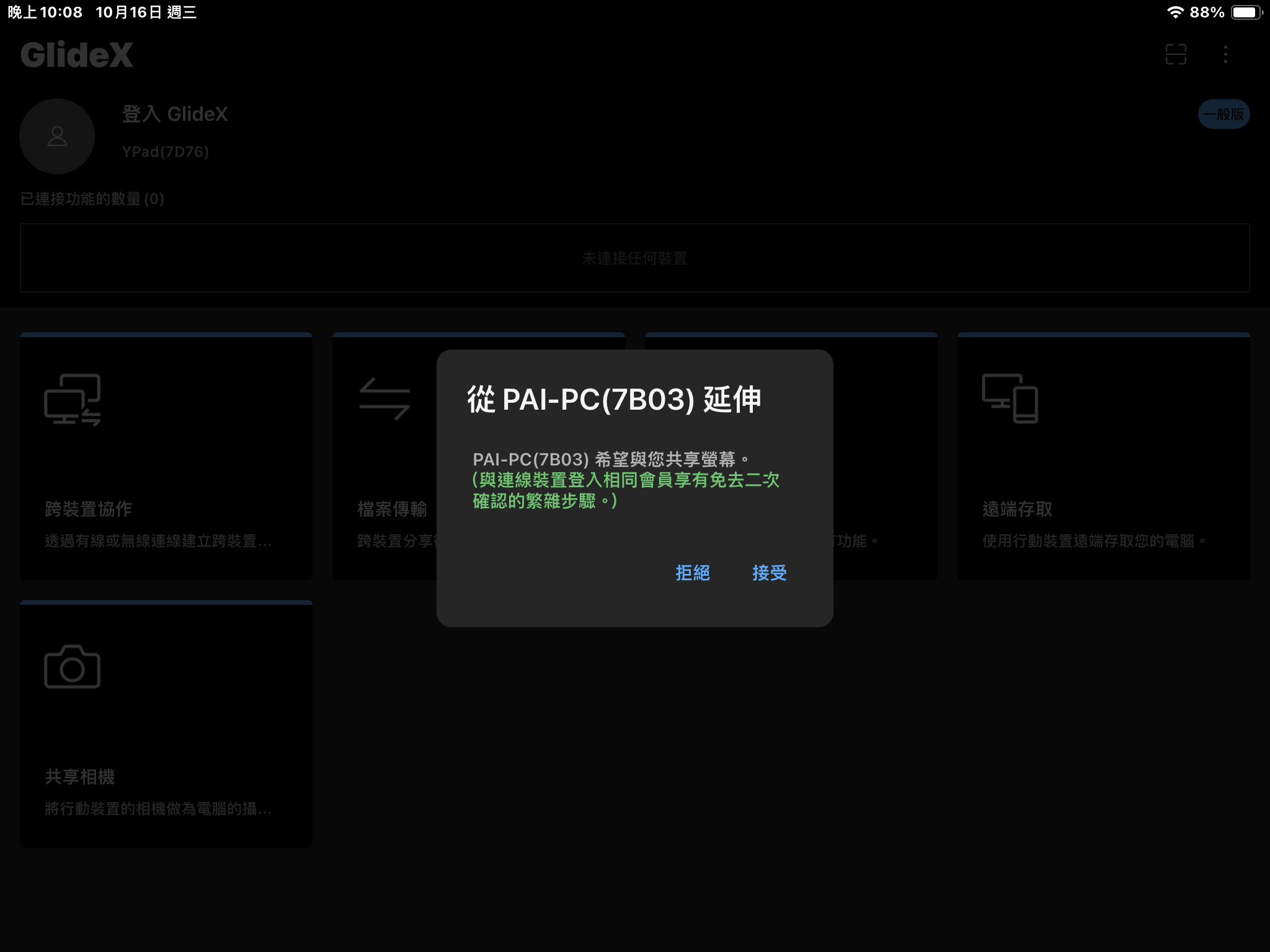 電腦端發起連線後,iPad 的 GlideX 會出現連線申請的提示,點擊接受將立即連線。