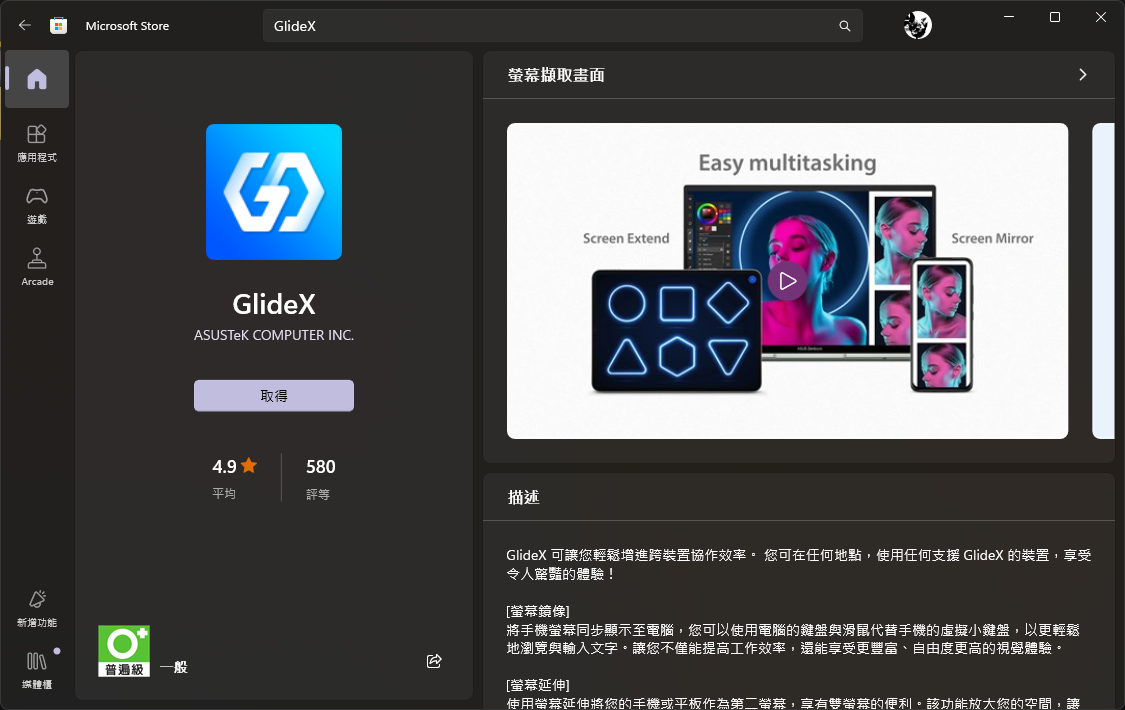 首先,開啟 Microsoft Store 搜尋並安裝 GlideX 軟體。