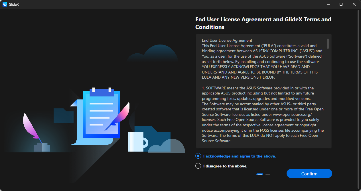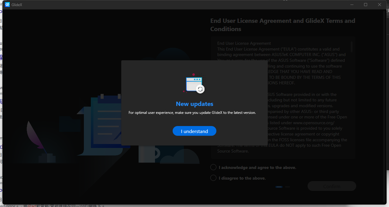 GlideX 會要求我們同意使用者軟體授權同意書和服務條款,請選擇第一個選項後點擊 Confirm。