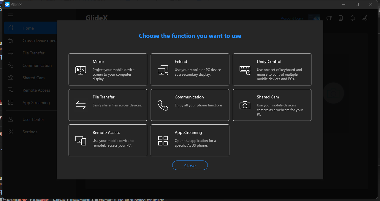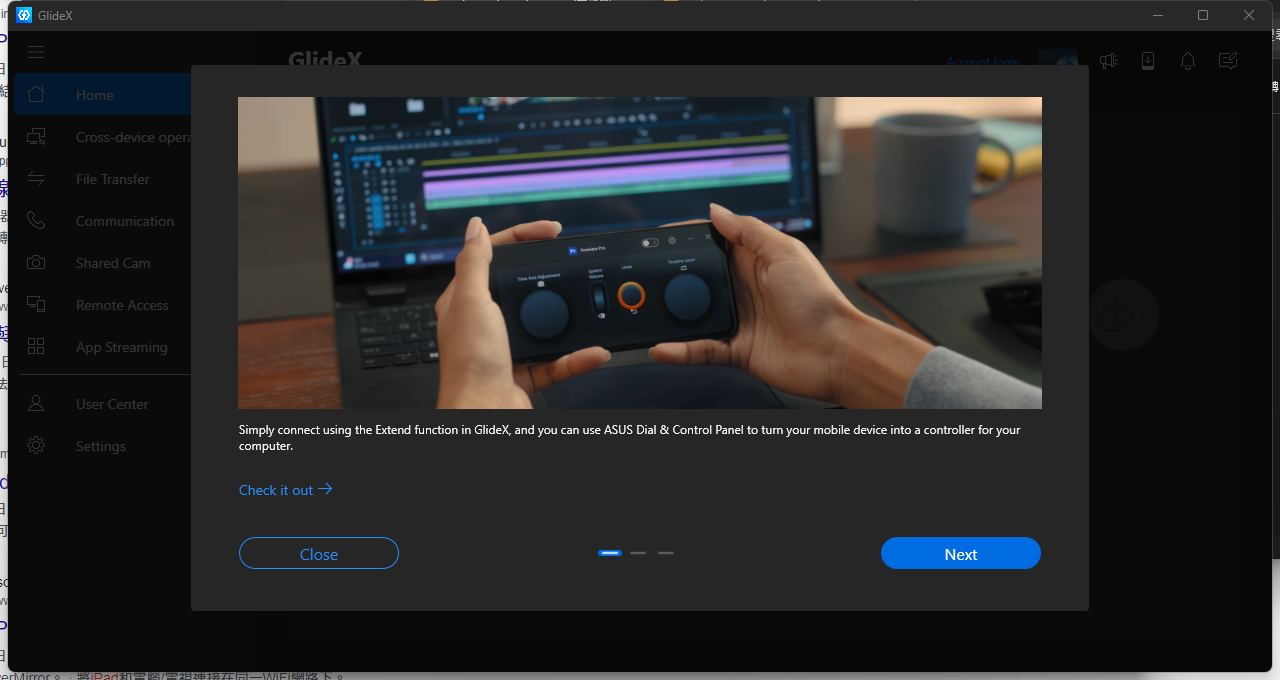 市面上有許多號稱能將電腦螢幕延伸到手機或平板的軟體,但要馬功能有限,不然就是強迫註冊會員要收錢。考慮到會把平板當作雙螢幕的使用者需求,ASUS 推出了一套能讓 Windows 電腦延伸或同步螢幕到其它 Windows、macOS、Android 與 iOS 裝置的免費軟體「GlideX」,且支援 WIFI 無線與 USB 有線兩種連線方式。