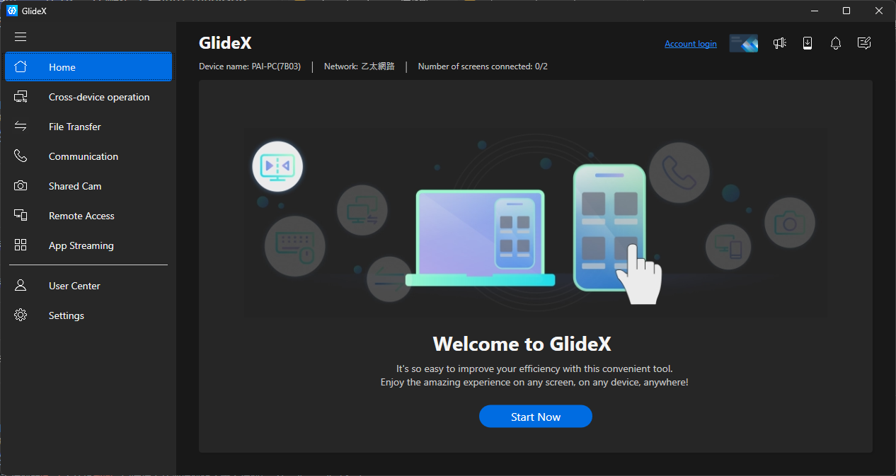 首先,要確保我們的 iPad 和電腦連線的是同一個網路,又或者有使用 USB 線連接 iPad 和電腦 (在公司或學校適合用有線)。連接完成後,點擊電腦的 GlideX 的 Start Now 開始連線。