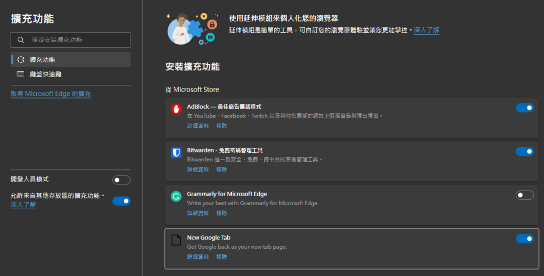 三、前往 edge://extensions 並將 New Google Tab 的開關打開。
